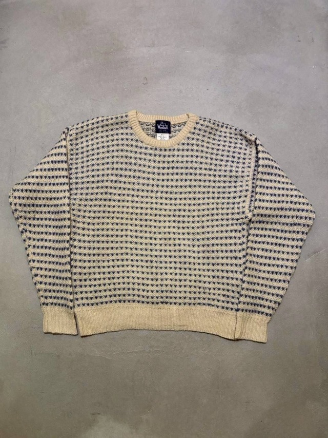 素材や柄、タグから推察するに80年代ごろでしょうか。 ダンスミュージックを感じる雰囲気のニットです。 ブランドはシアーズなので、世間の流行を捉えた感じでしょうか。 この手の幾何学模様チックなニットこそ全く同じ製品以外で被ることがほぼなく、まさに古着らしいアイテムです。 素材はアクリル。 ウールよりライトで扱いやすい生地なので、セーター類のなかでは割とガンガン着用できる部類だと思います。 タフに着回してください。 ◼️サイズ 表記:40 着丈:66cm 身幅:54.5cm 裄丈:93.5cm